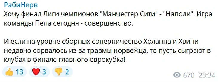 Журналист Игорь Рабинер написал во время матча «Ман Сити» и «Баварии», что хотел бы видеть в финале Лиги чемпионов английскую команду и «Наполи».