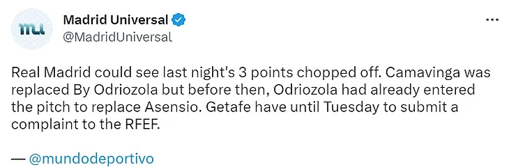 К тому моменту Одриосола уже вышел на поле, и поэтому некоторые испанские медиа написали, что Камавинга должен был либо остаться на поле, либо уйти и оставить «Реал» вдесятером. Но француз вместо этого был заменен, а значит, правила нарушены, ведь нельзя заменить двух игроков одним.