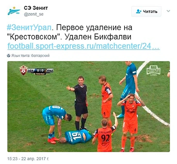 — Это беспредел! Поздравляем коллегию футбольных судей с таким достойным судейством на новой арене. В матче «Зенит» — «Урал» мы увидели прямое влияние арбитра Еськова на счёт, его воздействие на игру. На месте Александра Тарханова я бы увёл «Урал» с поля.