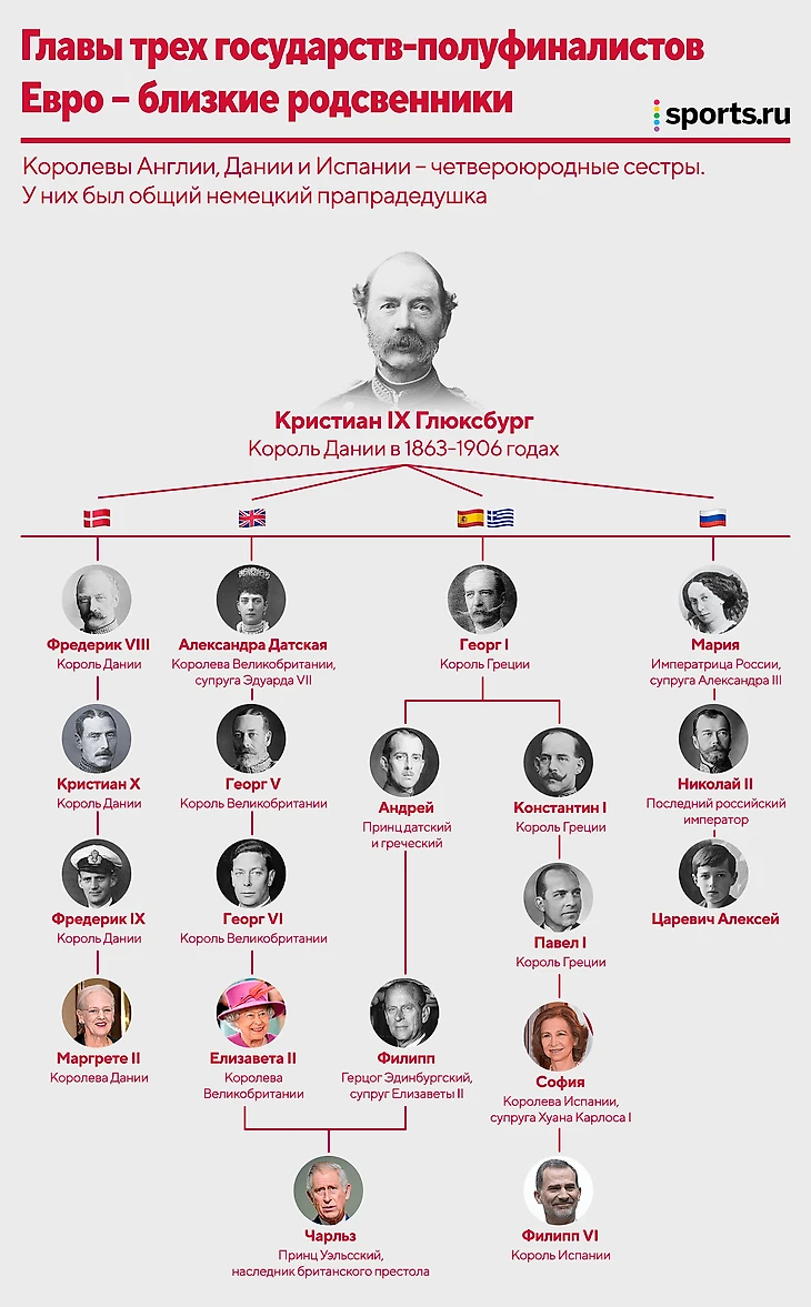По удивительному стечению обстоятельств королевские семьи трех полуфиналистов Евро-2020 – Англии, Дании и Испании – являются наиболее близкими родственниками среди всех оставшихся у власти в Европе монархий. Английская королева Елизавета II, датская Маргрете II и испанская София – четвероюродные сестры – у них общий прапрадедушка.