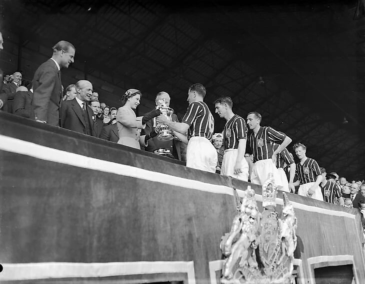 С ростом популярности футбола в обществе британские монархи начали регулярно появляться на футбольных матчах, главным образом – на финалах Кубка Англии. Традицию заложил дед Елизаветы II Георг V, присутствовавший на финальной игре Кубка в 1914 году. Матч проходил на стадионе «Кристал Пэлас» при 73 тысячах зрителей. «Бернли» победил «Ливерпуль», завоевав первый в истории трофей.Став королевой, Елизавета продолжила эту традицию – ее первым финалом стал матч 1953 года на «Уэмбли», в котором «Блэкпул», ведомый 38-летним сэром Стэнли Мэтьюзом победил «Болтон» 4:3.