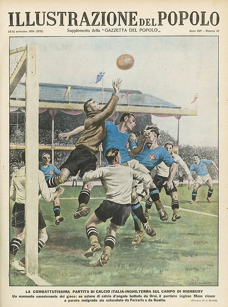 На трибунах стадиона «Хайбери» в холодный ноябрьский дождь собрались 56 тысяч зрителей. Итальянские футболисты приветствовали трибуны фашистским салютом, а затем на поле прорвался фанат с флагом Италии.