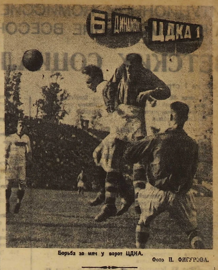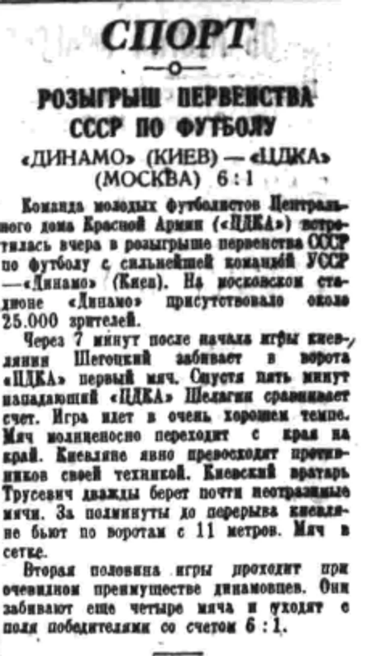 Благодаря медлительности Щегоцкого и Шиловского перед воротами ЦДКА "Динамо" упускает несколько возможностей, и только перед концом игры Комаров (ошибка, нужно Гончаренко. - Ред.) увеличивает счет до 6:1.