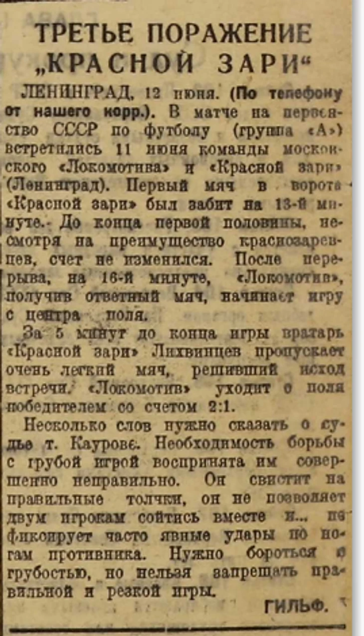 "Красная Заря" (Ленинград) - "Локомотив" (Москва) 1:2 (0:1)