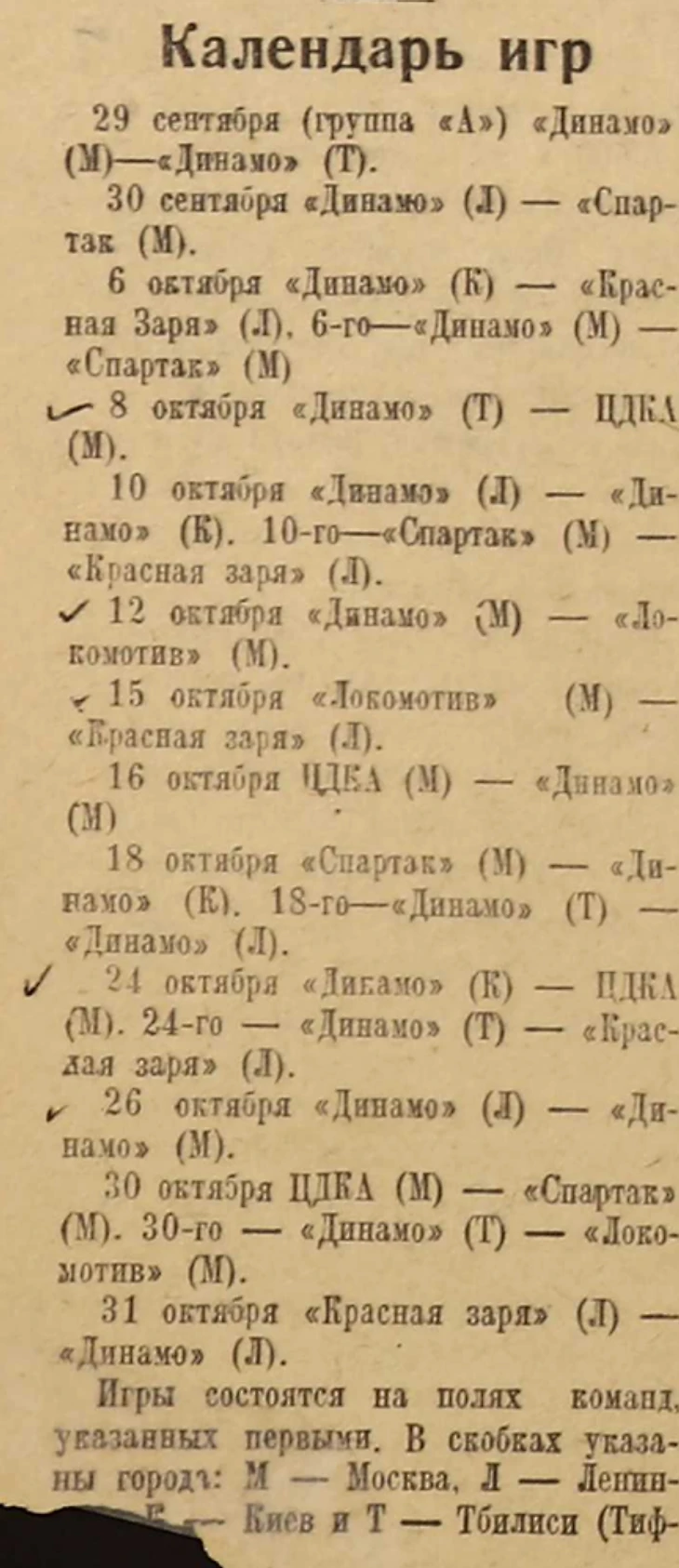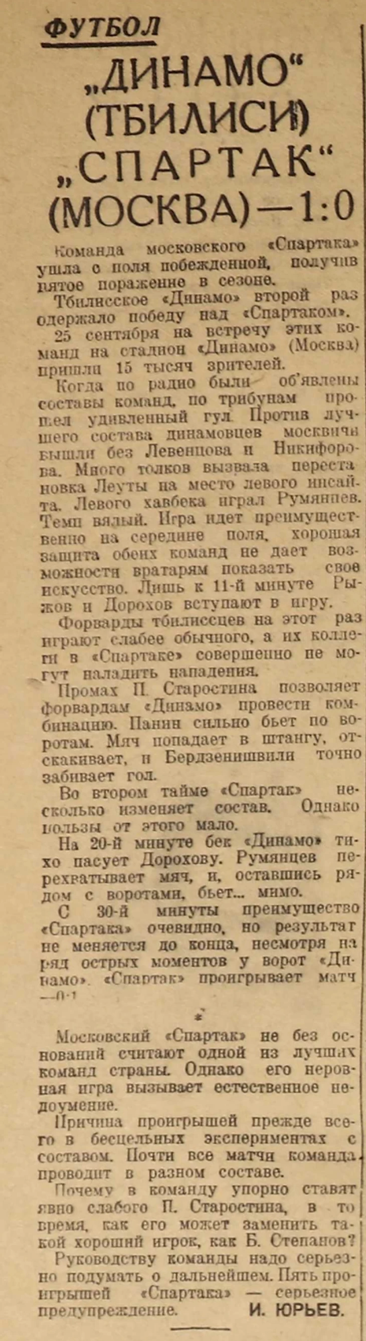 И вчерашняя встреча проведенная по календарю осеннего первенства СССР по футболу, снова принесла поражение "Спартаку" со счетом 0:1.
