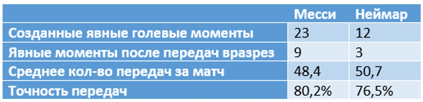 Неймар сделал больше голевых передач (11), чем Месси (9), но более глубокое изучение статистики показывает, что Лео создавал более качественные моменты партнерам и стал жертвой плохой реализации. Еще более внушительной разницу делает сравнение моментов после передач вразрез (самый трудный тип передач, который напрямую связан с мастерством) – Месси исполняет их в 3 раза лучше. Неймар больше пасует и больше рискует, но все равно недотягивает до качества моментов Лео.