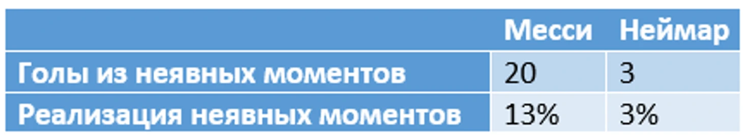 Информация от Opta, поэтому уточню определение. Явный голевой момент (clear cut chance/big chance) – «ситуация, в которой игрок при прочих равных должен забивать; как правило, выход один на один или удар с очень близкого расстояния». В неявном моменте, следовательно, все зависит от индивидуального класса игрока – без крутого исполнителя (или исполнителя, показавшего крутость в эпизоде) гол маловероятен. Месси дал «Барсе» 20 «маловероятных» мячей (как и полагается, лучший результат в Европе). Неймар – 3.