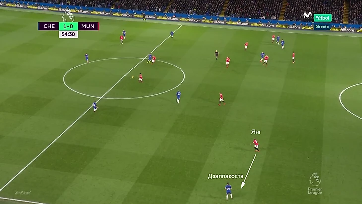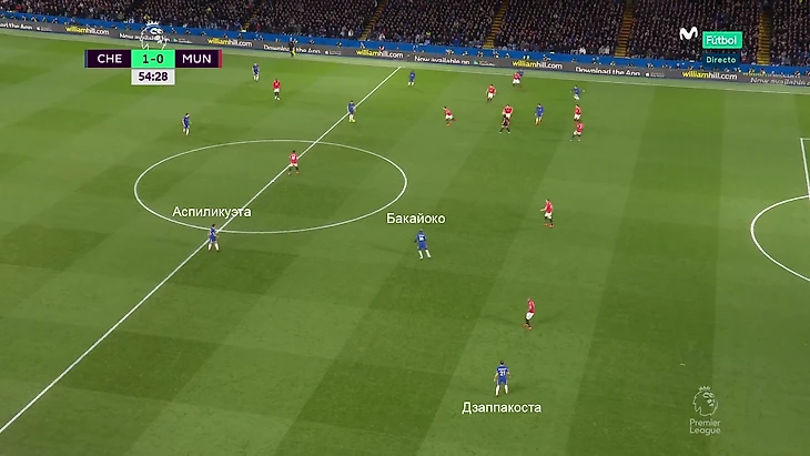 Эту свободу он получил благодаря умному движению Бакайоко и Дзаппакосты. Причем если первый сам грамотно выманил Фила Джонса, а потом увел от Аспиликуэты, второй сначала двигался неверно, но затем, получив подсказку от Антонио, сыграл незаметную, но важную роль в голе.