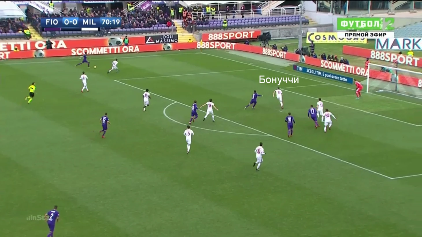 Бонуччи стянулся к мячу, несмотря на то, что его партнер по защите был в слишком высокой позиции. Это создало зону, которую использует Флоренци.