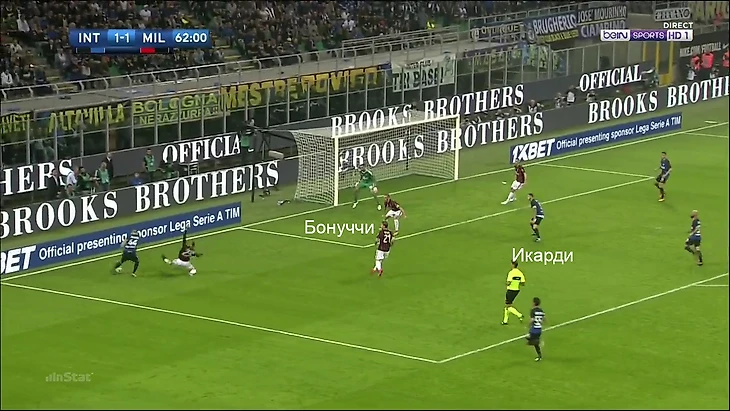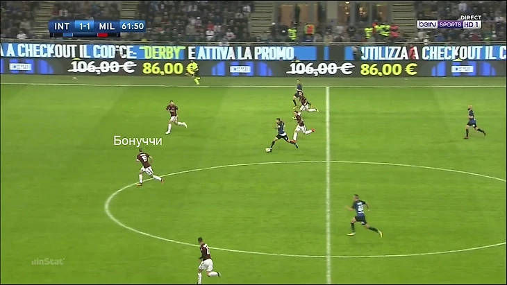 Бонуччи не выдвигается (приучился к тому, что в «Милане» не подстрахуют). Это позволяет атаке «Интера» развиться.