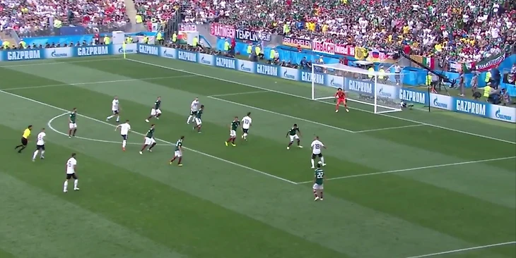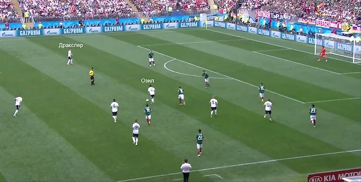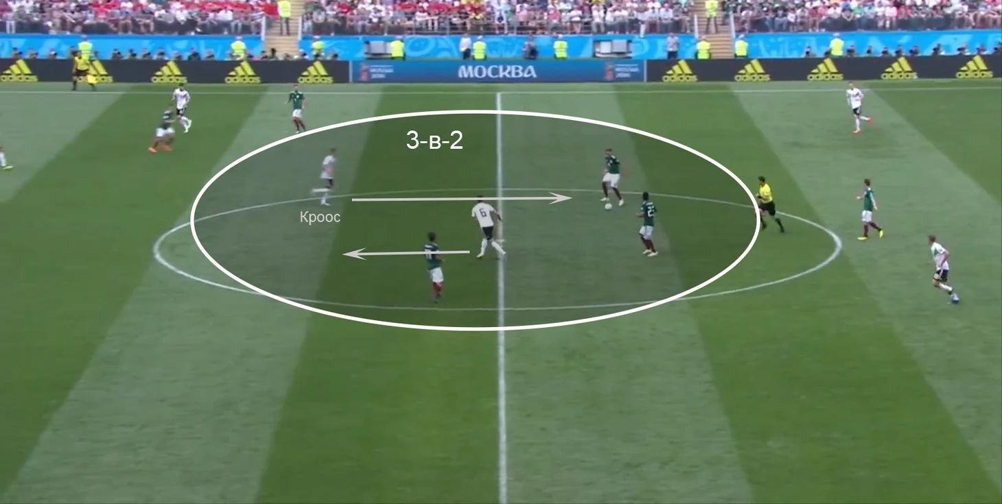 Это редкий эпизод, когда у Германии достаточно игроков за линией мяча в момент потери. Но Кроос решает прессинговать, несмотря на преимущество Мексики в центре, отсутствие поддержки от Хедиры и защитников, которые опускались (что логично). Результат: Мексика легко вскроет центр.