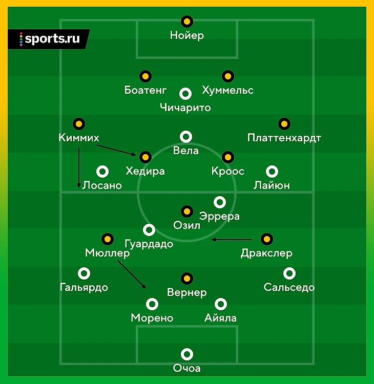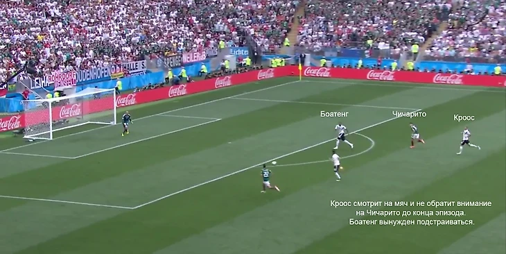 Боатенг пытался «передать» Кроосу Чичарито, но тот не сориентировался. Если бы Кроос прочитал эпизод, Боатенг мог бы страховать Озила, которого перед голом обыграл Ирвинг Лосано.