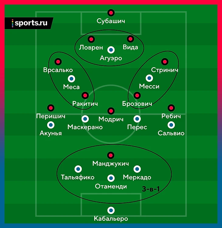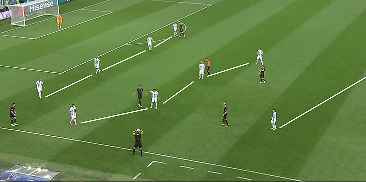 Три центральных защитника перекатывают мяч против одного нападающего. Когда мяч все-таки доставляется в атаку, Аргентине неизбежно не хватает игроков. Соперник в любой ситуации имеет преимущество (2-в-1, а при хорошем движении – 3-в-1) против каждого атакующего игрока команды Сампаоли. В лучшем случае итог такого владения – стерильность. В худшем – крайние игроки слишком раскрываются, Аргентина получает опасные контратаки. В матче с Хорватией было и то, и другое.