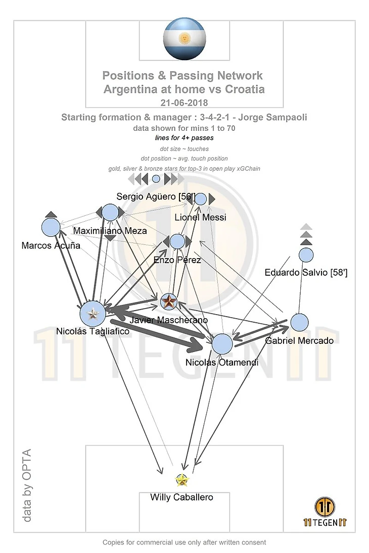 Два ключевых момента: 1) стерильность перепасовок между центральными защитниками; 2) нет связей между Месси, Месой и Агуэро (неудивительно, ведь каждого контролировали по 2 соперника).