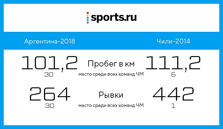Сборная Чили-2014 Сампаоли была самой интенсивной командой ЧМ – 6-й пробег в среднем за матч и наибольшее количество интенсивных рывков. Аргентина на позорном 30-м месте по этим показателям. Между результатами и пробегом нет прямой зависимости, но для стиля Сампаоли нужны цифры другого уровня.