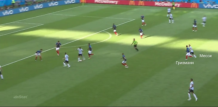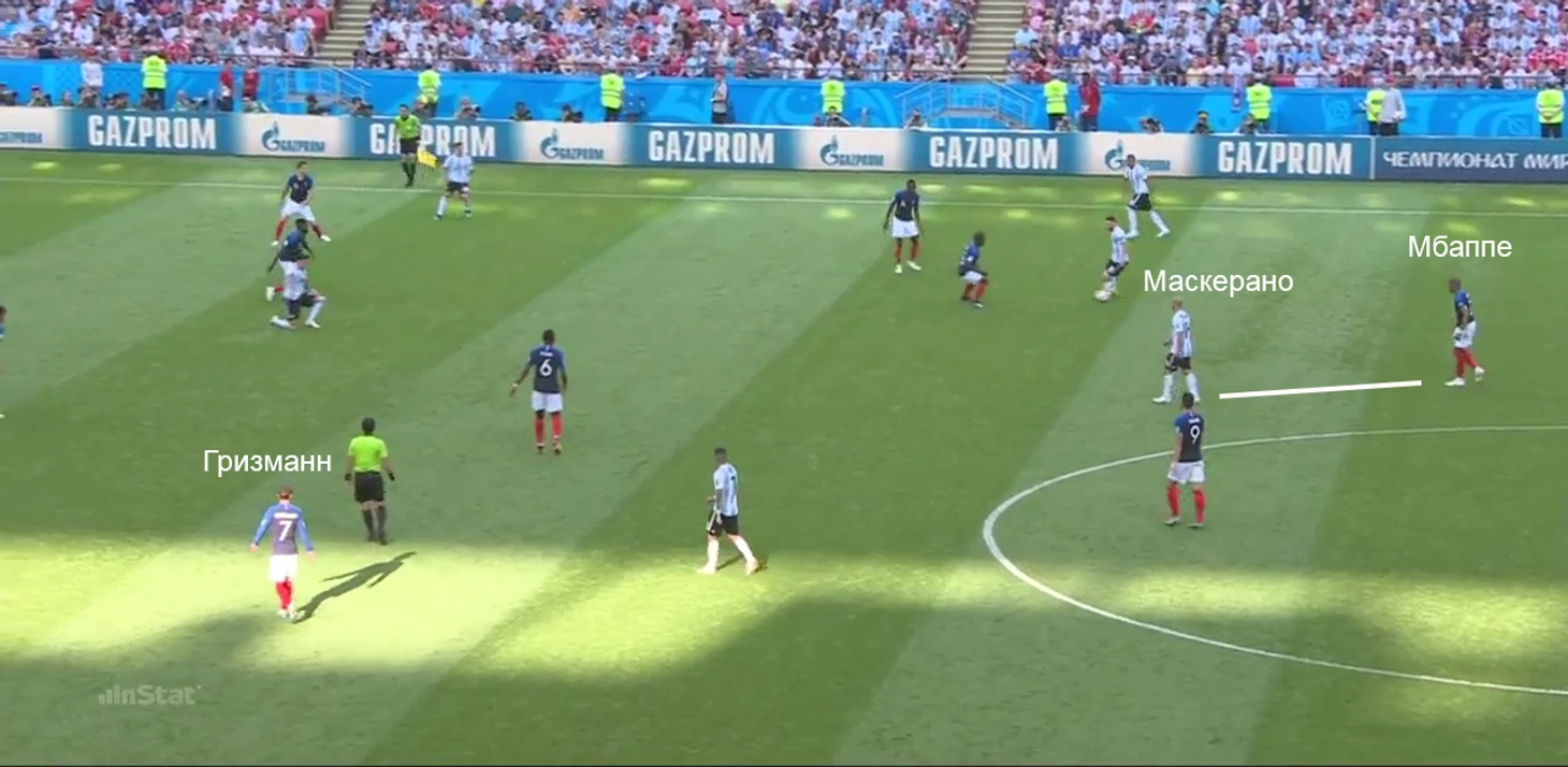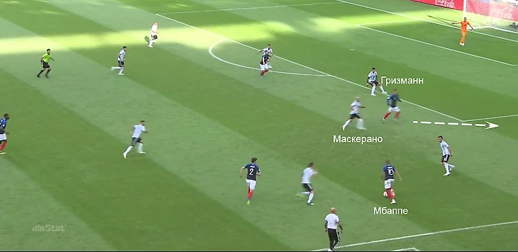 Вот показательный эпизод. Гризманн и Мбаппе ситуативно поменялись позициями. Сразу же начались проблемы. Мбаппе упускает Хавьера. Эпизод завершится пасом Маскерано вразрез (пускай в офсайд, но это Маскерано и пас вразрез!):