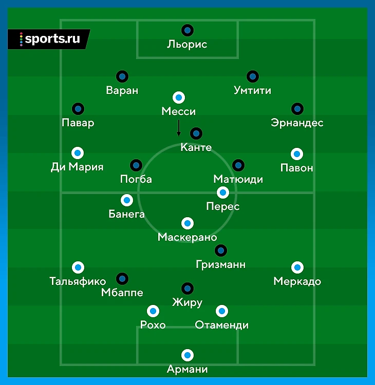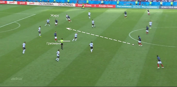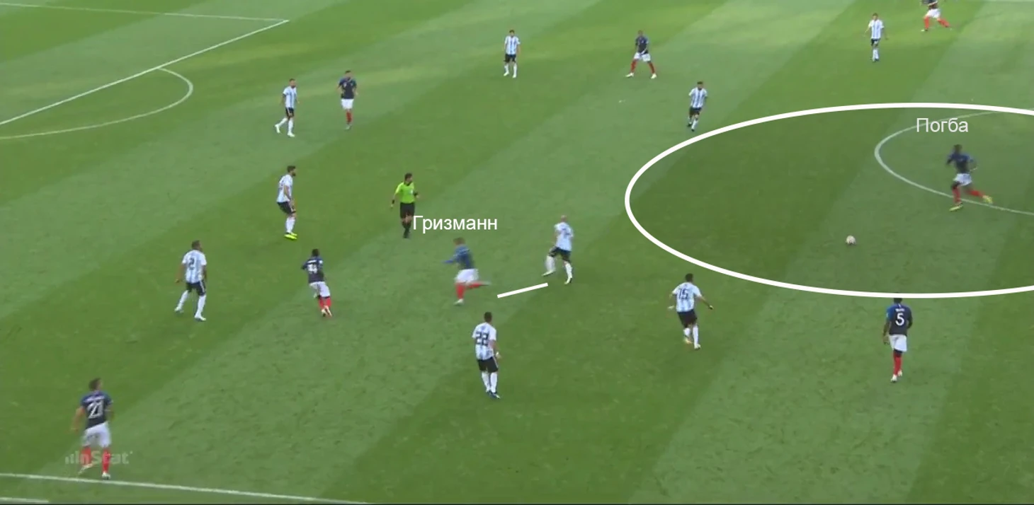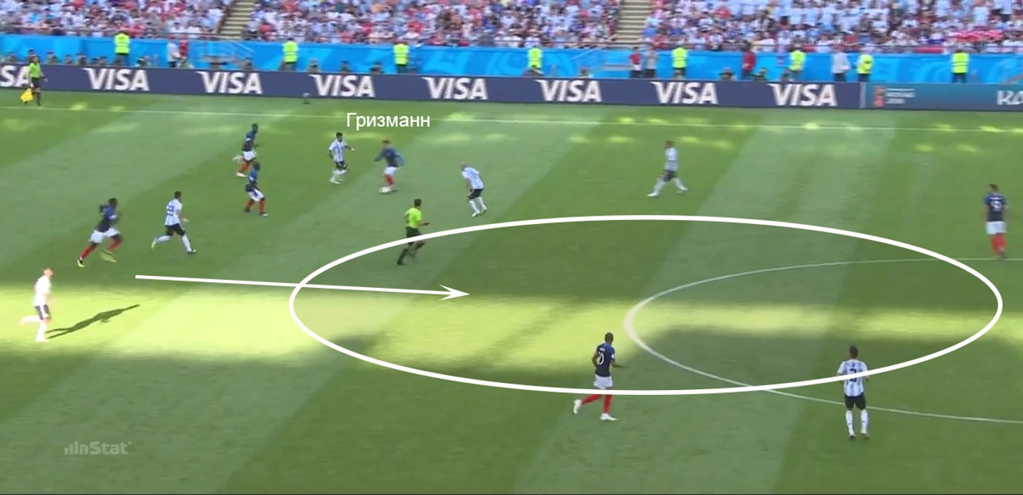 Франция играла 4-2-3-1. В теории при фирменном движении Месси в опорную зону с позиции нападающего Аргентина получает преимущество 4-в-3 в центре. Но благодаря ходу Дешама с Матюиди, все превращалось в 4-против-4. Франция спокойно контролировала зону.