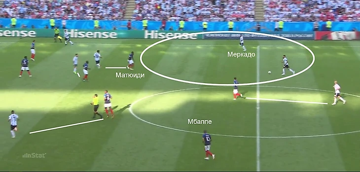 4-в-4 с опекой в центре поля, Меркадо свободен, у Мбаппе намного более высокая позиция, чем у Матюиди.