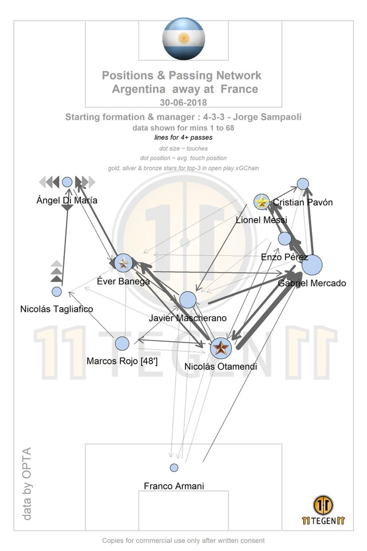 4. На другом фланге Дешам велел Килиану Мбаппе игнорировать оборонительную работу и оставаться в высокой позиции для контратак. Теоретически Николас Тальяфико мог использовать эту свободу, на практике он тоже оказался недостаточно хорош, плюс после чудес Мбаппе в начале матча фулбек остерегался смелых подключений.
