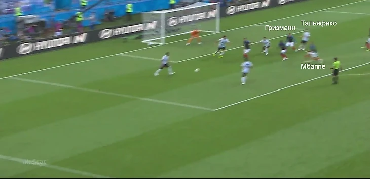 Сразу после паса Погба Гризманн совершил еще один умный рывок. Именно он заблокировал Тальяфико, который изначально играл с Мбаппе. Это помешало защитнику либо добежать за Килианом до конца, либо передать партнеру. Мбаппе забил.