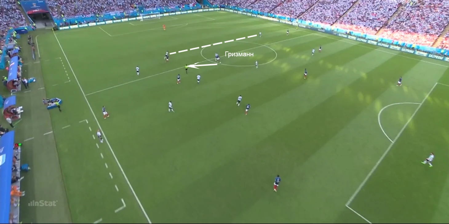 2) Прохождение прессинга Аргентины. Умное движение Гризманна помогло использовать эту проблему команды Сампаоли. Вот момент из первого тайма: