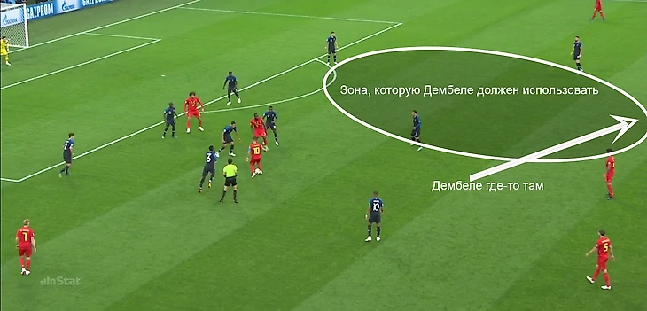 Дембеле облегчает задачу Франции, не используя очевидную свободную зону и не создавая вариантов для продвижения мяча.