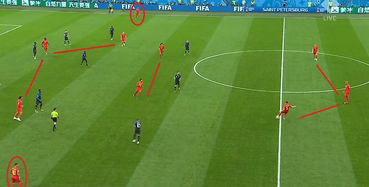 Против Уругвая (где прямой заменой Матюиди был Корентен Толиссо) и Аргентины это было частью плана французов. Они направляли соперника туда, считая, что Габриэль Меркадо и Мартин Касерес не несут угрозы. Матюиди почти игнорировал Меркадо, помогая центральной зоне. С Бельгией было иначе: они выставили против Блеза номинального вингера Шадли и дали ему в помощь де Брюйне.