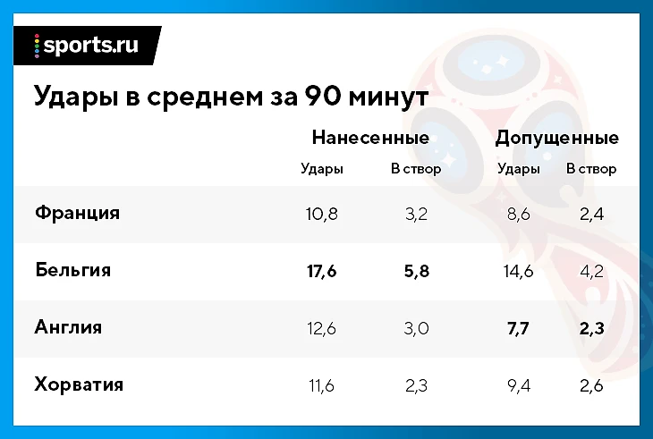Вот статистика четырех полуфиналистов. Есть четкое разделение на 3 прагматичных команды и одну атакующую. Оборонительные цифры Бельгии пострадали из-за труднейшего матча с Бразилией, но в большинстве игр она была сильнее остальных похожа на сбалансированный топ-клуб.