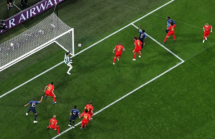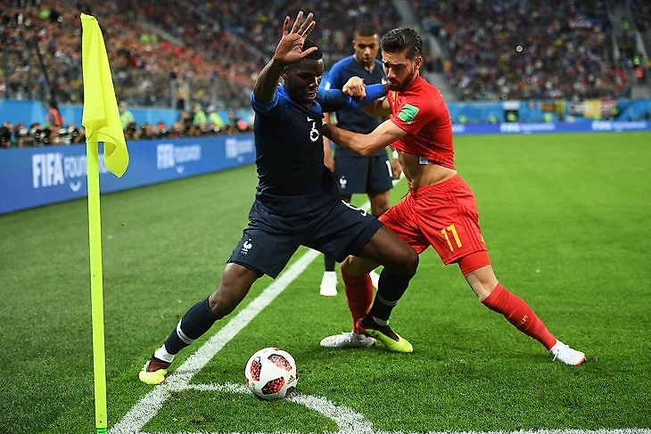 В первые полчаса картина была равной. Атакующий план Бельгии не работал, но без мяча они контролировали Францию, которая не могла начинать атаки через Погба и не хотела активно задействовать крайних защитников. К 30-й минуте было 3:3 по ударам и 42% на 58% по владению в пользу Бельгии. С 30-й до гола Самюэля Умтити – 10:1 по ударам в пользу Франции и 35% на 65% в пользу Бельгии по владению.