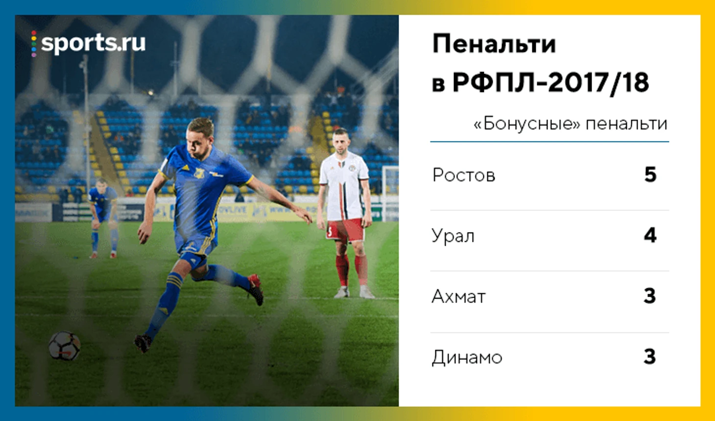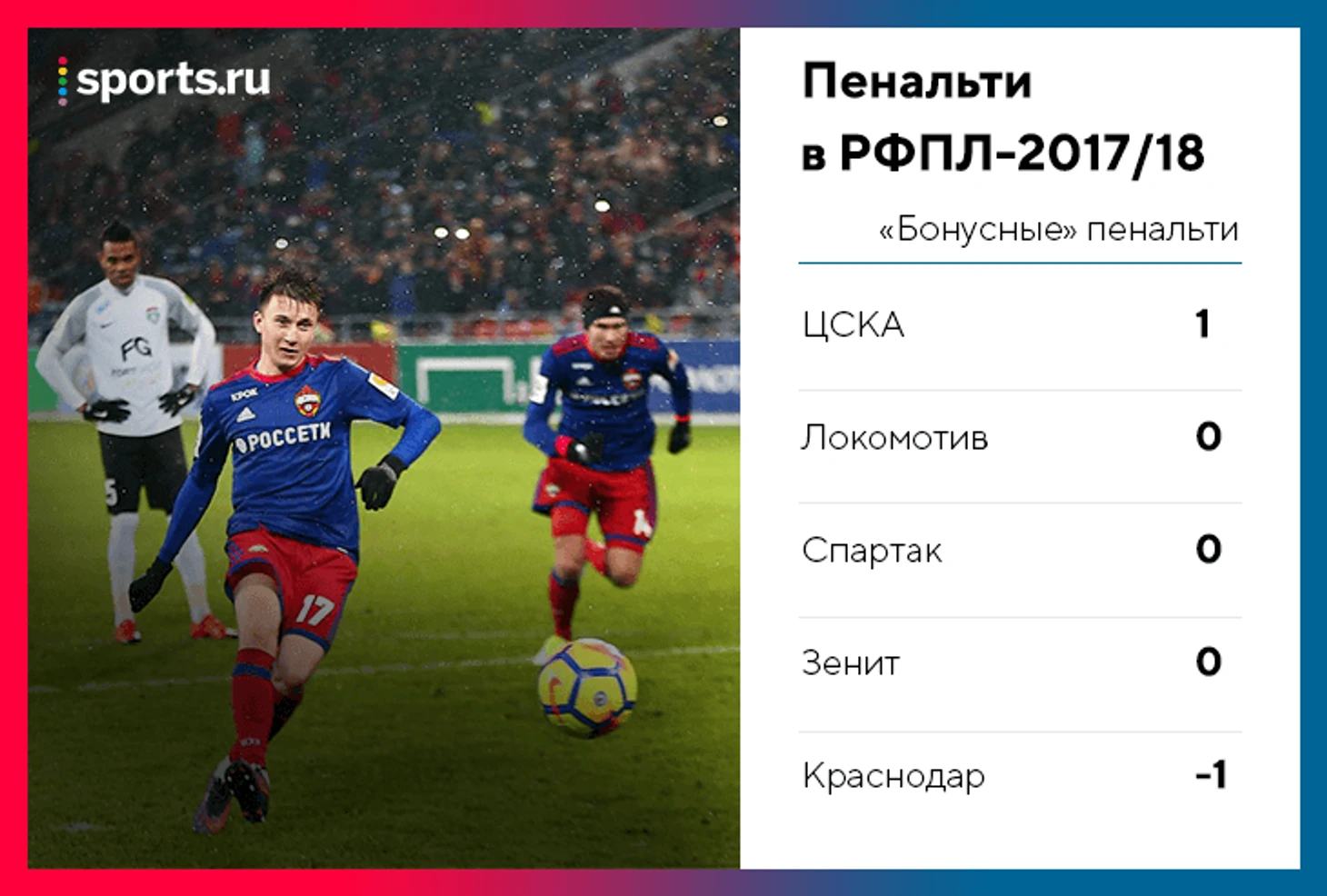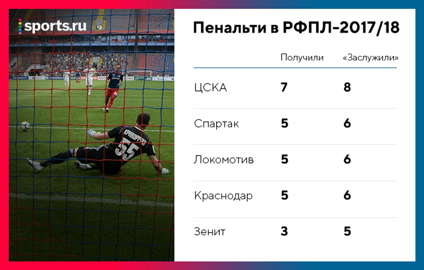 По этой системе все гранды могли бить пенальти почаще. Но важнее другое: результат ЦСКА не выделяется на этом фоне. Количество заработанных пенальти как раз соотносится со статистикой точных передач в острую зону. Вероятно, ЦСКА получил больше пенальти именно потому, что эффективнее давил на соперников.