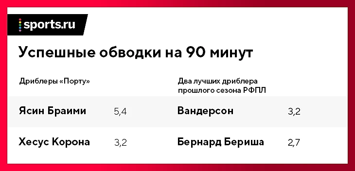 Ясин Браими и Хесус Корона показывают космические цифры. Если сложить показатели двух лучших дриблеров прошлого российского сезона, то получится чуть больше, чем у одного Браими (5,4 против 5,9). В РПЛ в принципе почти нет дриблеров такого уровня, не говоря уже о двух в одной команде.