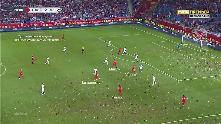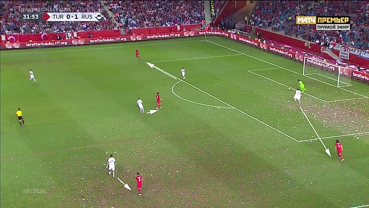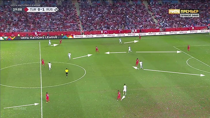 В последние 40 минут Турция адаптировалась к этой схеме прессинга. Окай Йокушлу оттягивался в линию к центральным защитникам. Пытаясь запрессинговать тройку, Россия оставляла крайнего защитника Турции свободным. Турки пользовались этим, чтобы разбить прессинг: