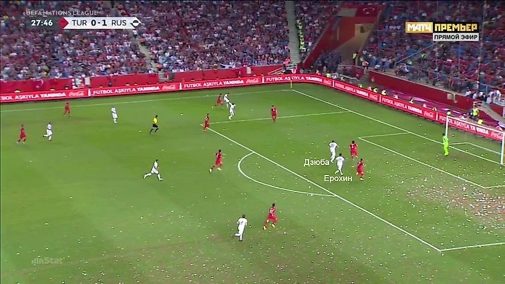 2. Главная фишка России на ЧМ – слаженное давление в схеме 4-4-2 без мяча. Россия в этом была так хороша, что в лучших матчах напрашивались аналогии с «Атлетико». Именно благодаря системе новая пара защитников и отсутствие Александра Головина практически не сказались на качестве игры в Турции (особенно до перестроений соперника во втором тайме).