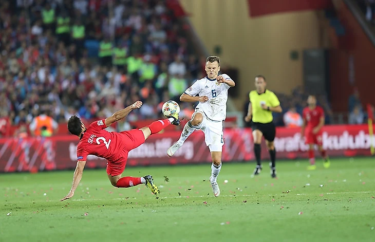 С Турцией некоторые детали того матча повторились. Снова для глубокой обороны Россия перешла на схему, которая как минимум ситуативно напоминала формацию с тремя защитниками (с Ерохиным в роли флангового защитника). Снова даже это не помогло, но помог вратарь – Лунев с 4 сейвами за 40 минут.