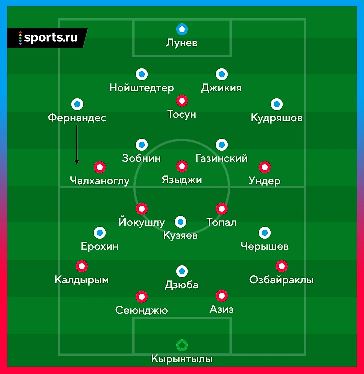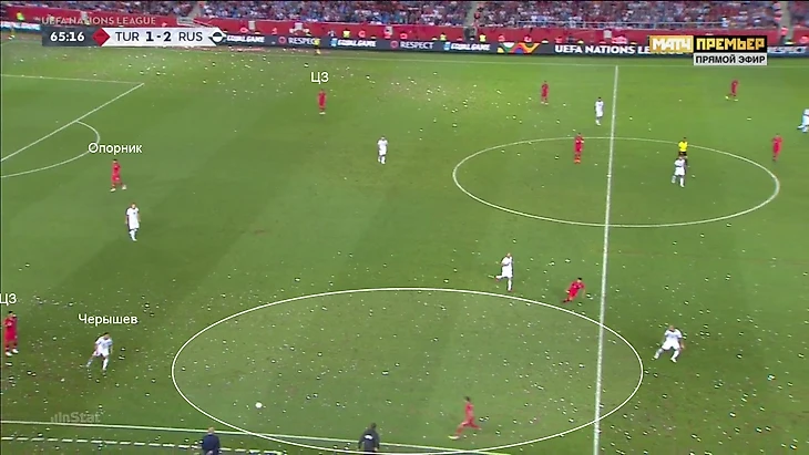 Черчесов отреагировал на такое давление заменой Дениса Черышева, а затем еще выпуском Константина Рауша вместо Федора Кудряшова. Алексей Ионов вышел на правый фланг, а Ерохин переместился налево, где формально играл левого вингера, но часто опускался за Озбайраклы так глубоко, что оказывался в линии с защитниками. Ерохин дисциплинированно делал эту работу, но это не решило проблему полностью.