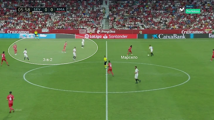 Чаще всего этот трюк проделывали с флангом Марсело. 42% атак «Севильи» шли через правый фланг. Как только Марсело выдвигался, в зону между ним и Рамосом следовало открывание. Открывались не только нападающие, но и сверхподвижный Пабло Сарабия.
