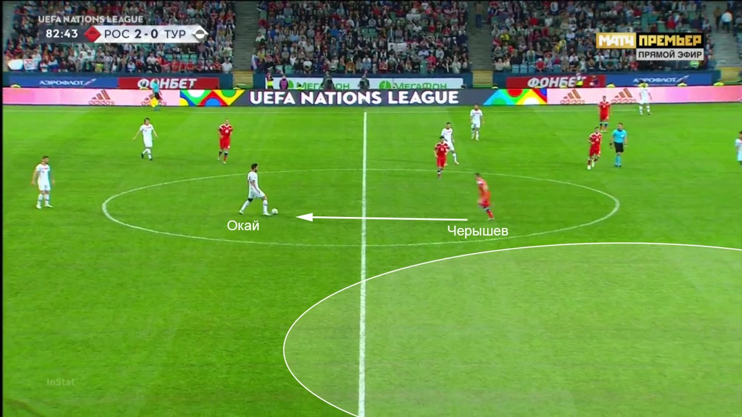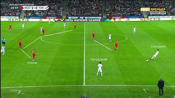 Из-за схемы России и правильных смещений относительно позиции мяча центральный защитник соперника Чаглар Сеюнджю имеет только один реальный вариант продолжения атаки – пас на левого защитника Хасана Калдырыма. Его сразу же накроет Алексей Ионов. Калдырым либо отдает назад, либо вперед по флангу в ловушку. Россия либо отбирает мяч, либо держит соперника на удобном расстоянии.