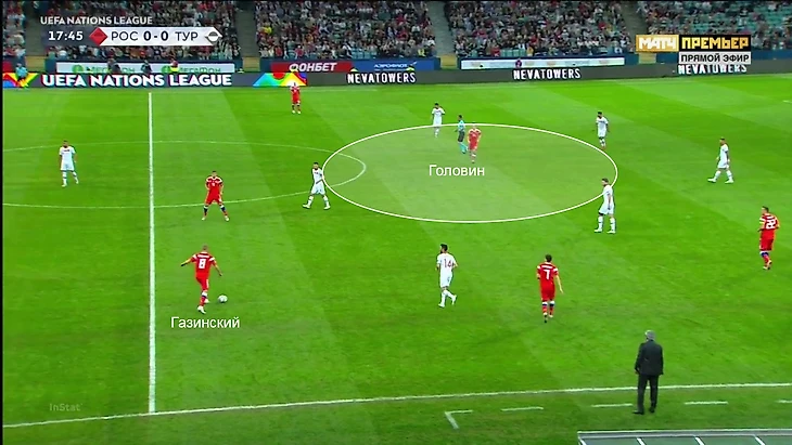 У России преимущество в центре 4-в-3 благодаря смещению Головина, которому можно отдавать, но Газинский предпочитает перевести мяч на Джикию.