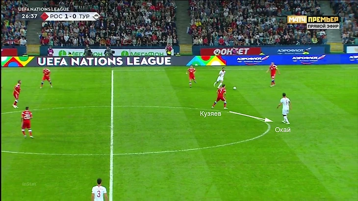 Тот же эпизод Кузяев снова оглядывается на Окая, но готов давить на защитника в случае, если последует пас назад.