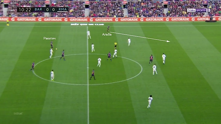 Второй вариант. Теперь Начо боится выдвигаться. Альба свободен и легко обработает пас Ракитича.