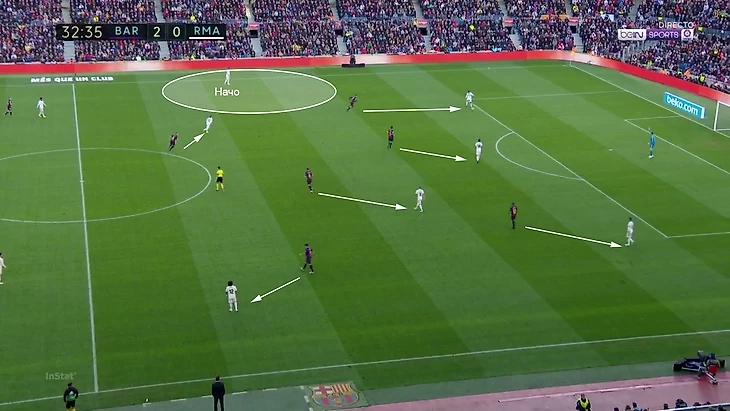 6. После того, как счет стал 1:0, «Мадрид» рассыпался. Команда распалась на две части – те, кто прессингует, и те, кто играет по изначальному плану. Вскрывать такой неорганизованный прессинг – легкая для «Барсы» задача.