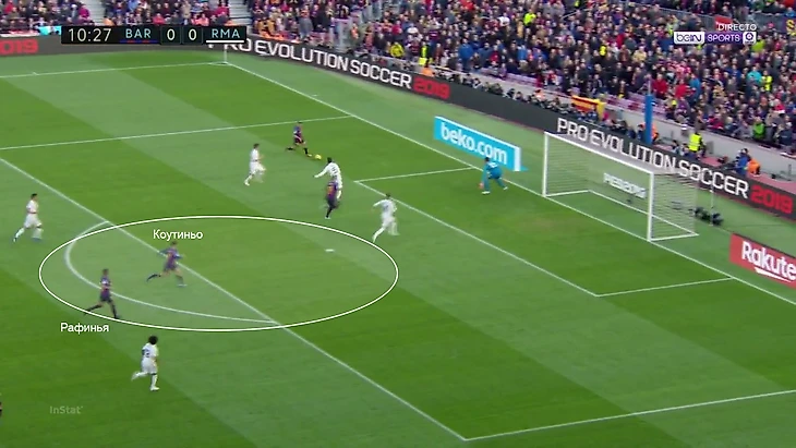 Проявилась и еще одна постоянная проблема – полупозиция Модрича и Крооса. Они не оказывали постоянного давления на полузащитников «Барсы», но в то же время не опускались достаточно глубоко, чтобы помогать против Рафиньи и Коутиньо в опорной. Результат – оба бразильца готовы были замыкать пас Альбы: