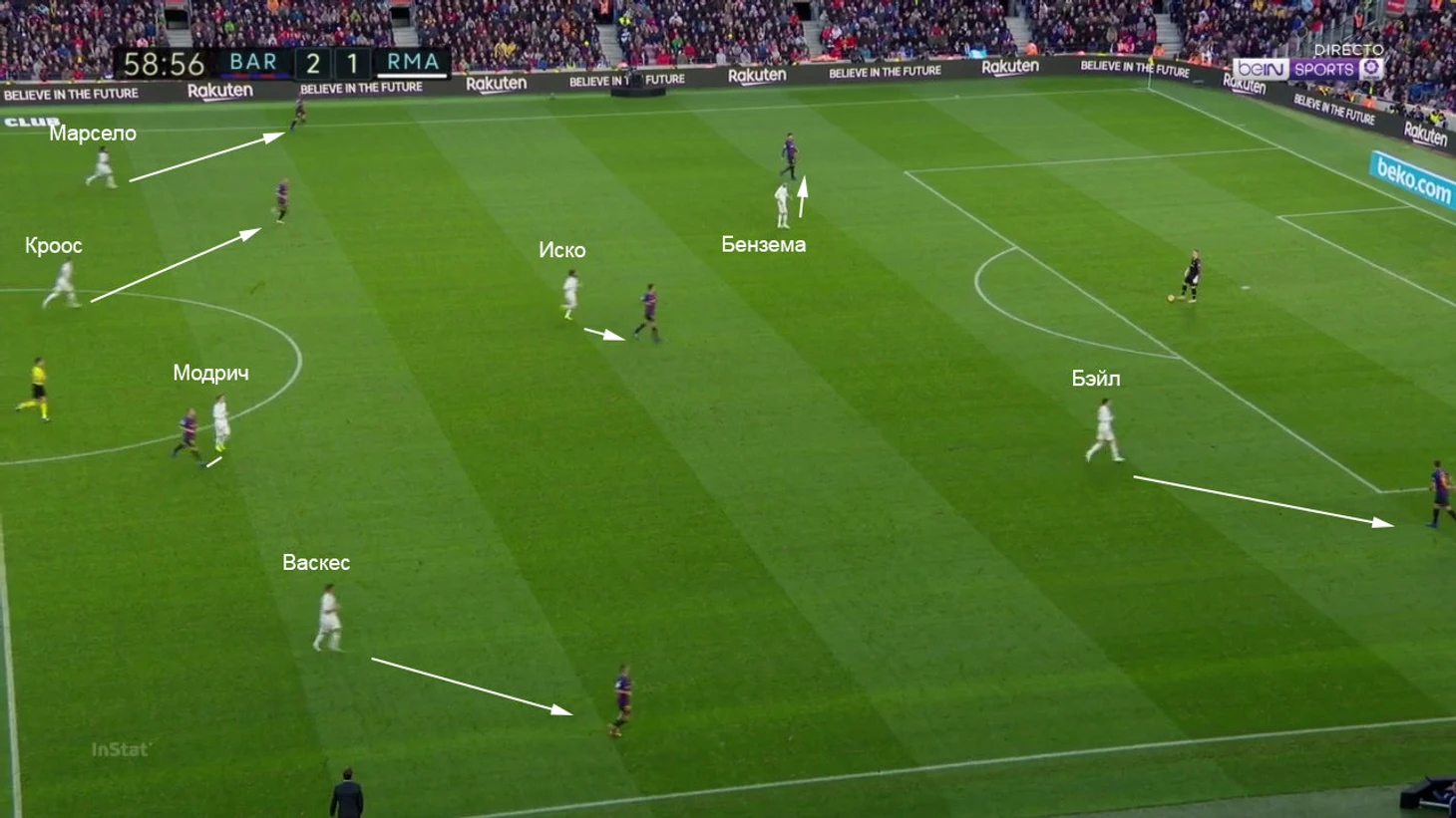Такая ситуация возникала из-за отказа от прессинга полузащитников и защитников «Барсы». Нужно либо давление на соперников или полноценная помощь Гарета Бэйла и Иско крайним защитникам. Ситуация, когда нет ни того, ни другого, а самим Начо и Марсело не хватает четкой инструкции – самая ужасная. «Барса» выбрала в качестве мишени Начо – и разрывала фланг таким образом.