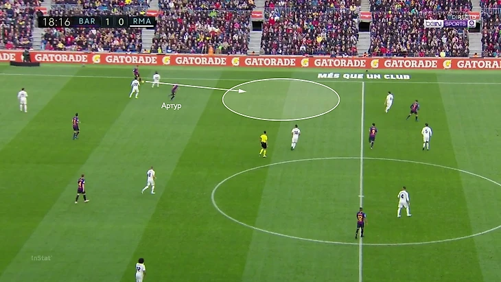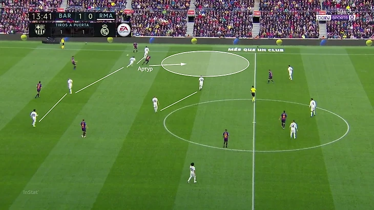 Четверка игроков «Реала» прессингует. Вперед для давления на Лангле выдвинулся Модрич. Но Каземиро и Кроос его не поддерживают, оставаясь на обычных позициях. Артур замечает зону разрыва давления и сразу же в нее открывается.