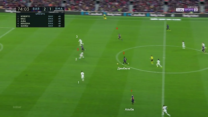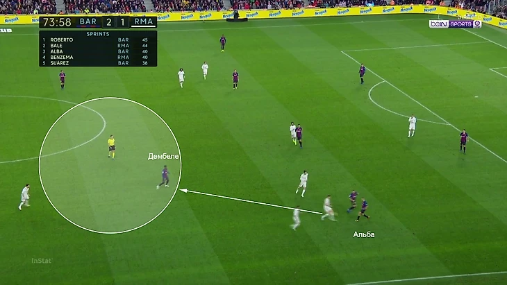 Рывок Альбы после паса создает «Барселоне» численное преимущество в контратаке. В том числе поэтому Усман Дембеле так свободно тащит мяч.
