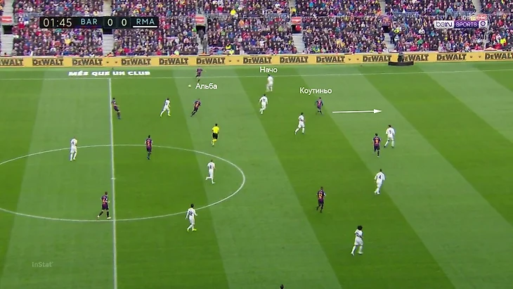 Первый вариант развития событий. Начо сразу же выдвигается на Альбу. Но Коутиньо открывается в зону, которую он оставил.