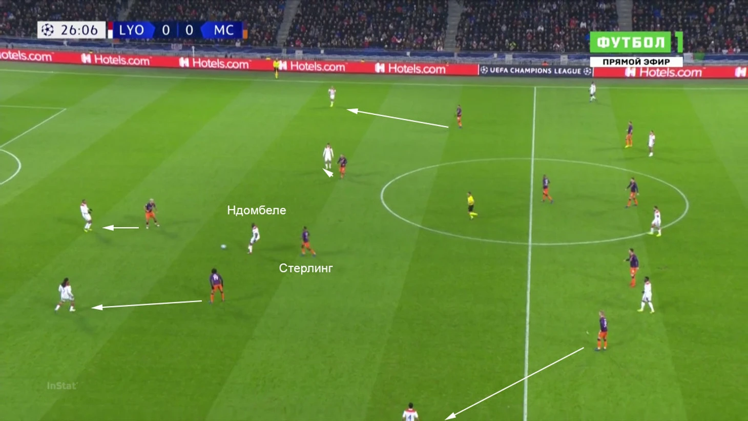 В этом эпизоде «Сити» не допустил значимой ошибки при прессинге. Ндомбеле получает мяч спиной к воротам, его накрывает Рахим Стерлинг, у Танги нет очевидных вариантов. Но вместо потери Ндомбеле развернется и отдаст пас вперед.