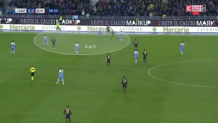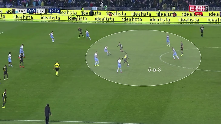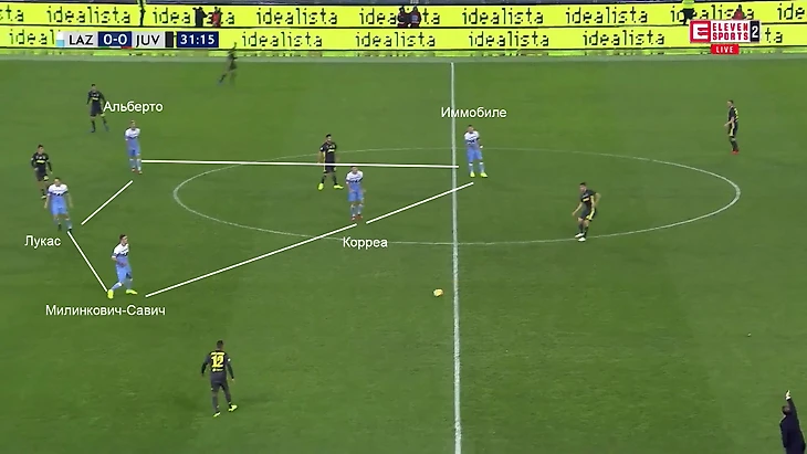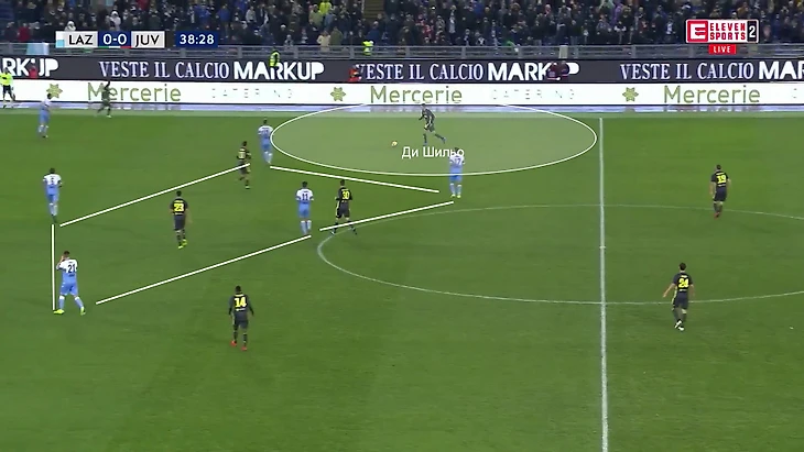 Пятерка из двух нападающих (Иммобиле и Корреа) и трех полузащитников (Лукас, Милинкович-Савич и Альберто) компактным блоком перекрывает центральную зону. Нападающие готовы накрывать центральных защитников «Ювентуса» в случае небрежного паса. Относительную свободу получают только крайние защитники Де Шильо и Сандро. Даже на них через пару секунд выдвигался кто-то из полузащиты (Милинкович-Савич или Альберто) – у «Лацио» все равно оставалось четыре игрока в центре.