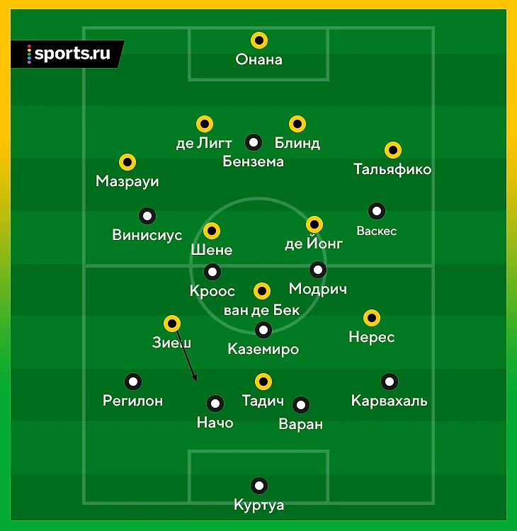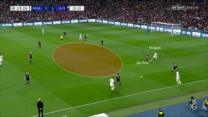 Кроос и Модрич играют слишком персонально против Шене и де Йонга. Причем Кроос на определенном этапе собьется на беготню за мячом, чем разрушит и без того рискованный вариант прессинга: