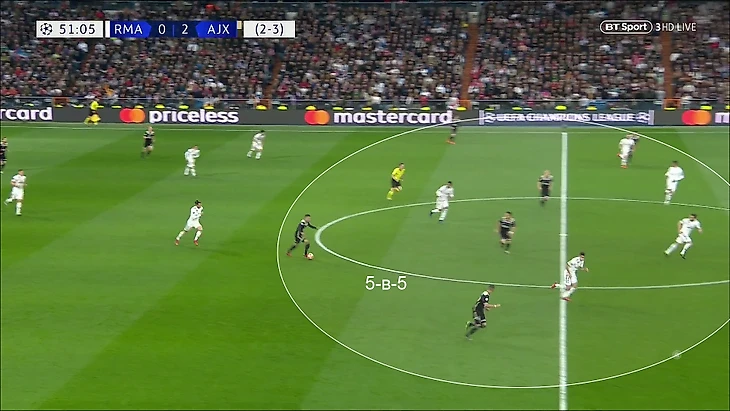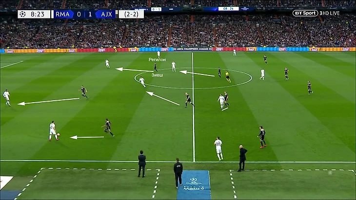 «Аякс» держит «Мадрид» персонально в центре поля, защитников прессингует трио Нерес-Тадич-Зиеш; Регилон остается свободным, но до него трудно доставить мяч: